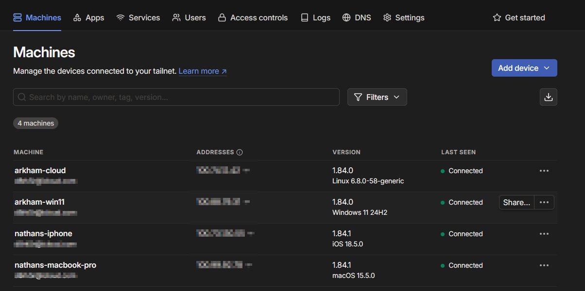 Head to login.tailscale.com/admin/machines and make sure all your devices appear as Connected. Each one gets a unique Tailscale IP and hostname.